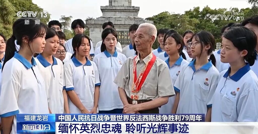 在福建龙岩市闽西革命烈士纪念碑前,245名烈士后代、退役军人、龙岩卫生学校师生瞻仰并敬献鲜花。92岁的老游击队员张国武讲述了自己的战斗故事。