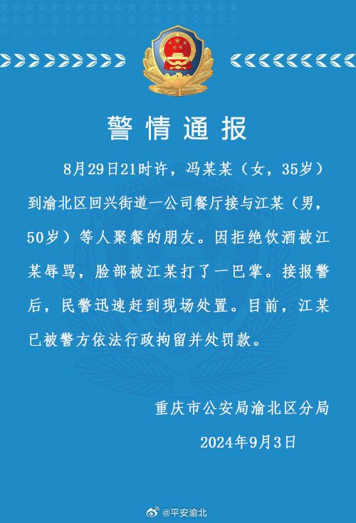 央视网消息:9月3日,重庆市公安局渝北区分局发布警情通报:8月29日21时许,冯某某(女,35岁)到渝北区回兴街道一公司餐厅接与江某(男,50岁)等人聚餐的朋友。因拒绝饮酒被江某辱骂,脸部被江某打了一巴掌。接报警后,民警迅速赶到现场处置。目前,江某已被警方依法行政拘留并处罚款。