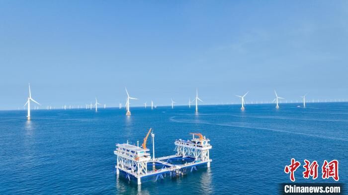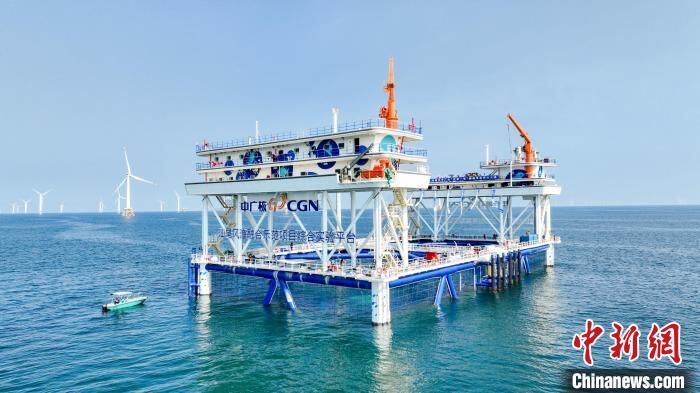 中新社汕尾9月4日电 (索有为 朱丹)全球单体最大抗台型风渔融合网箱平台——中广核“伏羲一号”,4日正式在广东汕尾建成投运,并完成首批养殖鱼苗投放,该项目可正面抗击17级超强台风,对于中国“海上风电+海洋牧场”产业融合发展具有重要示范意义。