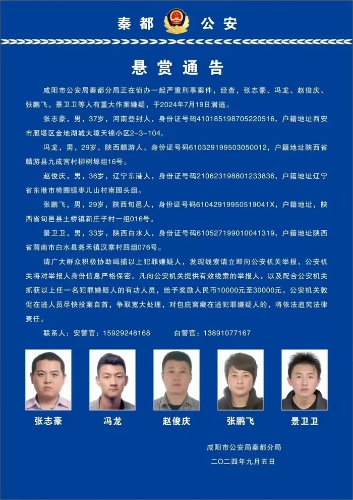 ·陕西咸阳5名严重刑事案件嫌犯潜逃,警方发布悬赏通告。