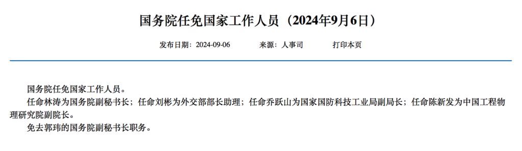 任命林涛为国务院副秘书长;任命刘彬为外交部部长助理;任命乔跃山为国家国防科技工业局副局长;任命陈新发为中国工程物理研究院副院长。