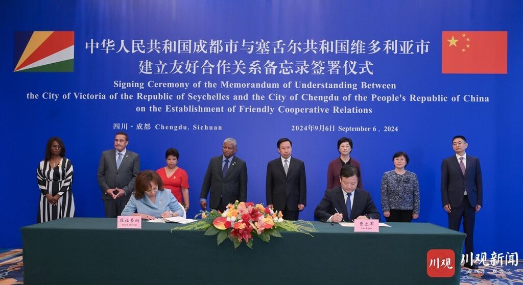 随后,省委常委、成都市委书记曹立军和塞舌尔驻华大使拉福蒂纳分别代表双方签署《中华人民共和国成都市与塞舌尔共和国维多利亚市建立友好合作关系备忘录》。