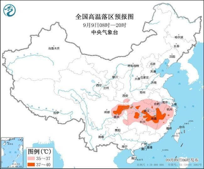 预计9月9日白天,陕西南部、河南南部、安徽中南部、湖北、湖南中北部、江西、浙江大部、福建西北部、四川盆地大部、重庆大部、贵州东北部等地有35~36℃高温天气。