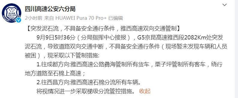 据@四川高速公安六分局 消息,9月9日5时36分(分局指挥中心接报),G5京昆高速雅西段2082Km处突发泥石流,导致道路双向交通中断,不具备安全通行条件(现场暂未发现车辆和人员被困),现采取以下管制措施: