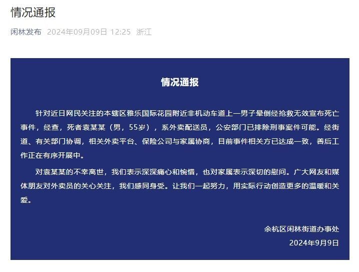 据“闲林发布”微信公众号消息,杭州市余杭区闲林街道办事处发布情况通报:针对近日网民关注的本辖区雅乐国际花园附近非机动车道上一男子晕倒经抢救无效宣布死亡事件,经查,死者袁某某(男,55岁),系外卖配送员,公安部门已排除刑事案件可能。经街道、有关部门协调,相关外卖平台、保险公司与家属协商,目前事件相关方已达成一致,善后工作正在有序开展中。