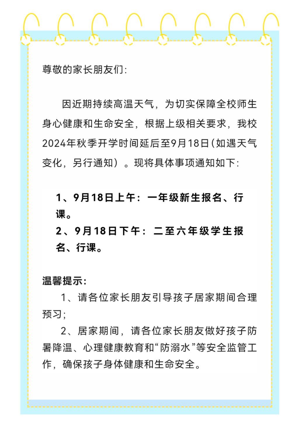 “9月6号,班主任老师通知说,新学期,孩子们换了新教室,我们去学校帮忙搬了东西,还打扫了卫生,期待9月9日开学。没想到,9月7日下午接到通知,说再次延迟开学,9月18日才正式上课。”达州市大竹县第一小学的学生家长田女士告诉记者,大家一起打扫新教室的卫生时,有家长朋友开玩笑说,大竹的高温天气一直在持续,“预测”孩子们不能在9月9日如期开学,没想到结果还真是如此。