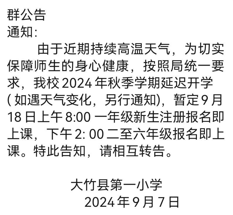 封面新闻记者了解到,除了大竹县第一小学,大竹县还有城区的三小、八小、大竹中学、大竹二中、大竹四中等中小学以及乡镇上的石河中学、清水镇中心校、庙坝中学等学校,均同步发布了再次延迟开学的通知。这些学校的通知中,有的只涉及部分年级的开学时间继续延后,有的是全校学生均继续延迟开学,但特别备注了“如遇天气变化另行通知”。与此同时,达州主城区的绝大多数公立中小学和幼儿园,以及渠县等气温较高的区县,也有不少公立中小学和幼儿园,陆续发布继续延迟开学的通知。这些学校继续延迟开学时间后,正式上课的时间基本上都定在9月18日。