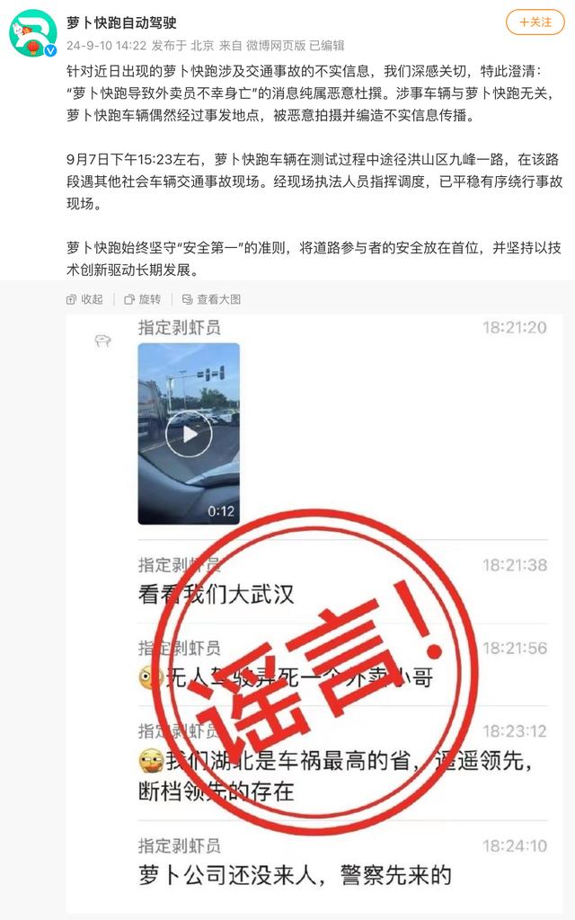·萝卜快跑回应车辆致外卖员身亡:测试车偶然经过事发点,被恶意拍摄并编造信息。