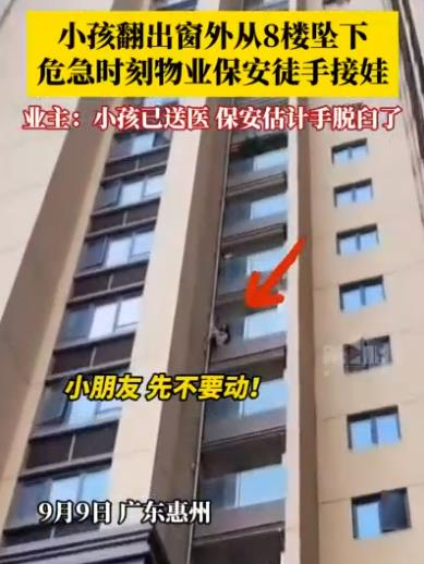 ·广东惠州一小孩翻出窗外从8楼坠下,危急时刻物业保安徒手接娃。小区业主表示,小孩已送医,保安估计手脱臼了。