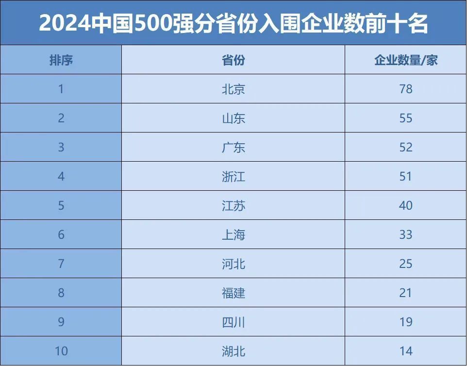 2024中国企业500强分布最多的五个省份依次是北京、山东、广东、浙江和江苏。