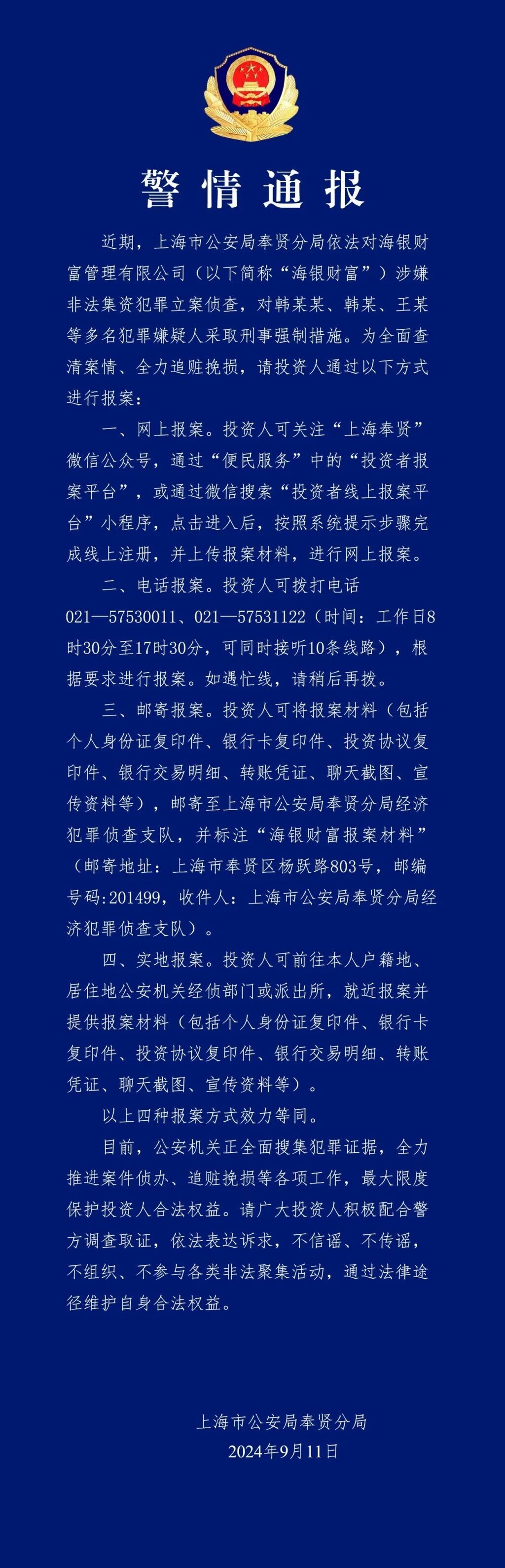 9月11日上午,上海市公安局奉贤分局发布警情通报,依法对海银财富管理有限公司涉嫌非法集资犯罪立案侦查,对韩某某、韩某、王某等多名犯罪嫌疑人采取刑事强制措施。目前公安机关正全面搜集犯罪证据,全力推进案件侦办、追赃挽损等各项工作,最大限度保护投资人权益。