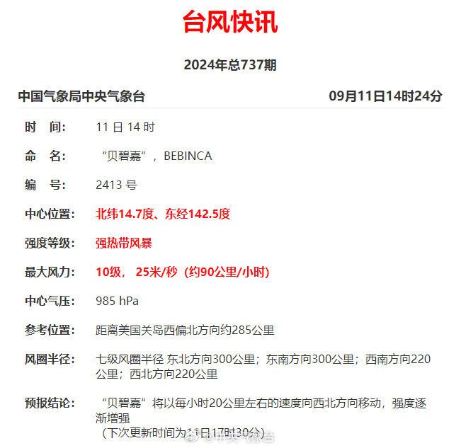 央视网消息:中央气象台9月11日消息,台风“贝碧嘉”目前已经升级为强热带风暴,中心附近最大风力有10级( 25米/秒)。