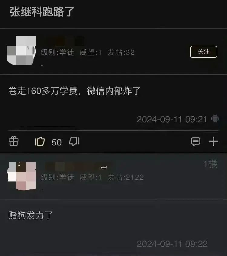 一张截图显示,有社交账号称张继科跑路了,卷走160多万元学费。大皖新闻记者注意到,该图片在网上引发广泛议论,各种猜测甚嚣尘上。
