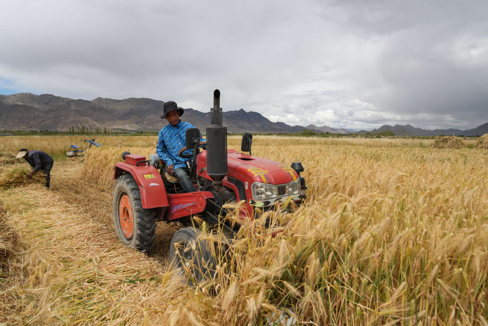 “西藏粮仓”奏响丰收曲,图为西藏日喀则市白朗县巴扎乡农民操作农机收获青稞。