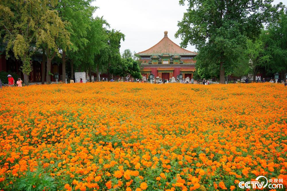 北京,北海公园近千平方米的硫华菊进入盛花期,与万佛楼古建交相辉映,美景如画。