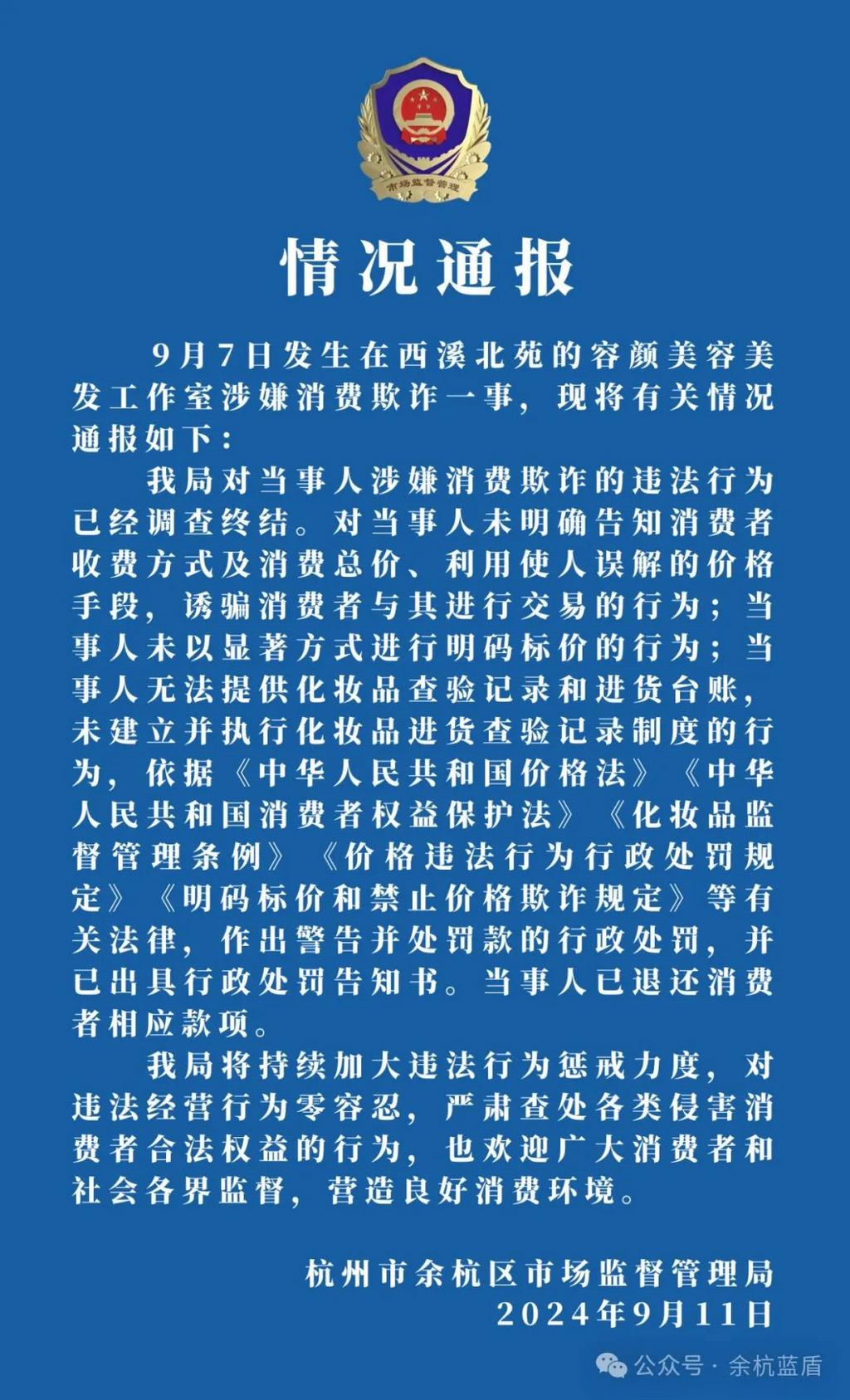 ·杭州余杭再通报“少年剪烫发被索要四千元”:已退还相应款项。