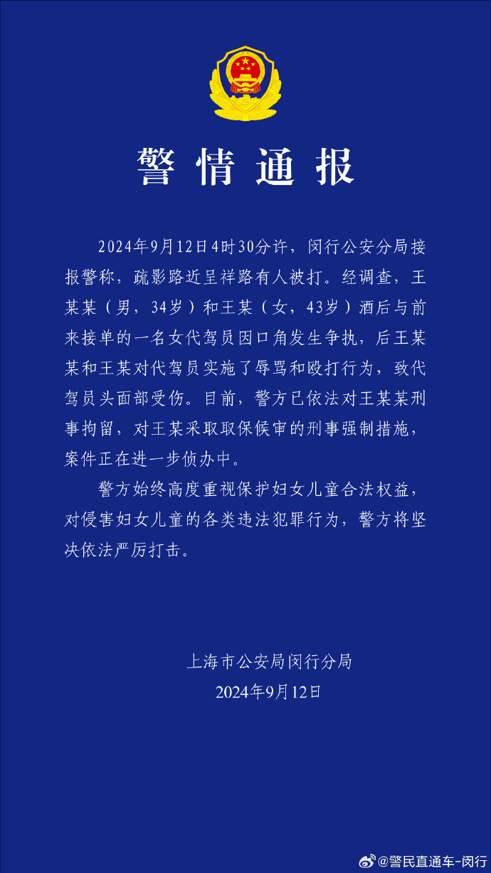·上海警方通报“两人酒后殴打代驾员致其头面部受伤”:1人刑事拘留1人取保候审。