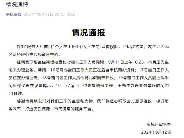 ·一政务大厅被指4个窗口3人不在岗?杭州官方通报。