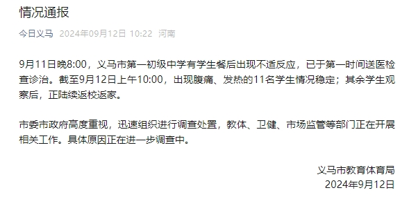 ·河南义马市一中学学生餐后出现不适反应,官方通报:已送医, 11名学生情况稳定,具体原因正在调查。