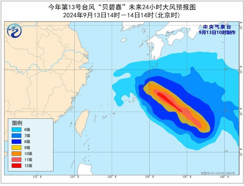 今年第13号台风“贝碧嘉”(强热带风暴级)的中心今天(13日)上午8点钟位于琉球群岛那霸市东偏南方向约1080公里的西北太平洋洋面上,就是北纬21.7度、东经137.1度,中心附近最大风力有10级(28米/秒),中心最低气压为982百帕,七级风圈半径100-250公里,十级风圈半径60公里。