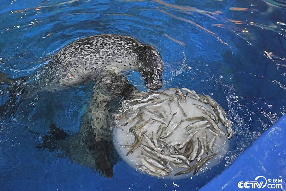 为了让极地动物们感受到中秋的温馨和喜悦,武汉极地海洋公园保育员根据不同动物饮食喜好,准备了一场别开生面的“定制版”月饼盛宴。图为斑海豹正在享用“冰皮”鱼月饼。