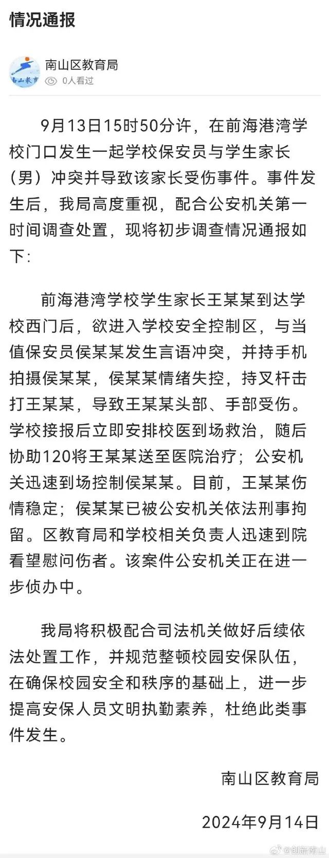 ·南山区教育局通报深圳一学校保安持械打伤学生家长:保安已被刑拘。