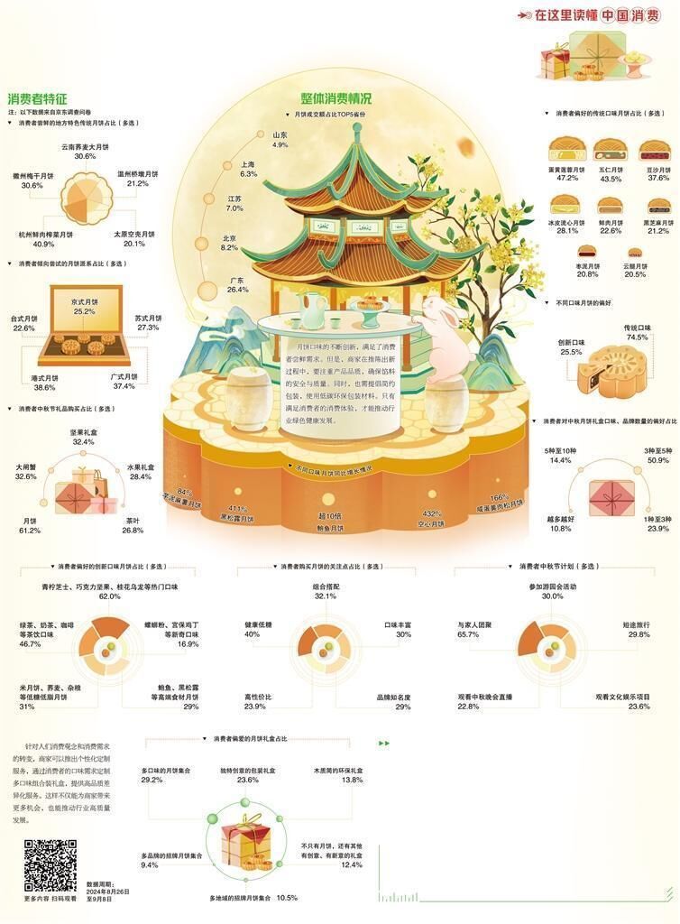 今年中秋节,“多口味组合装月饼”迎来消费热潮。数据显示,超三成消费者强烈呼吁“希望找到组合装月饼,能一次性尝到不同品牌不同口味的月饼”,超七成消费者希望中秋礼盒中包括3种以上不同口味、品牌的月饼。此外,也有四成消费者关注健康的低糖月饼。这反映出消费者对月饼的消费需求只增不减,也预示着未来月饼行业发展仍有较大潜力,商家需抓住节日热点,迎合消费者需求,加强不同口味月饼的供应,严格把控产品质量。