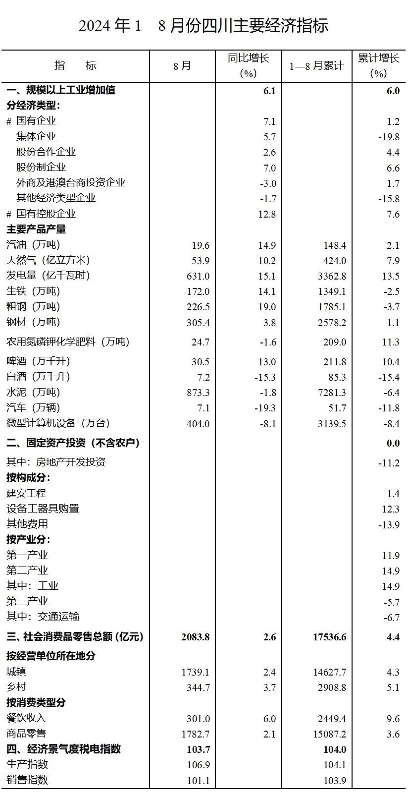 9月15日,省统计局发布今年1—8月四川省国民经济主要指标数据。数据显示,1—8月,全省规模以上工业增加值同比增长6.0%,增速比全国高0.2个百分点;全省实现社会消费品零售总额17536.6亿元,同比增长4.4%,增速比全国高1个百分点。
