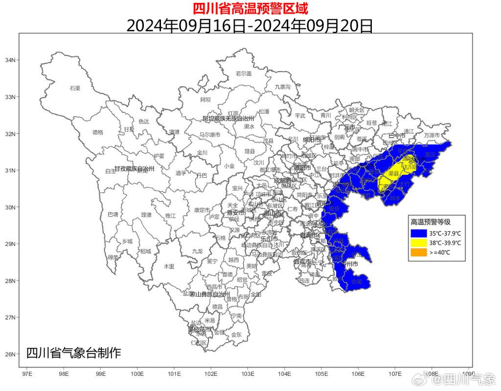 预计9月16—20日,达州、广安2市以及南充、遂宁、资阳、泸州4市东部和巴中南部日最高气温可达36—39℃。