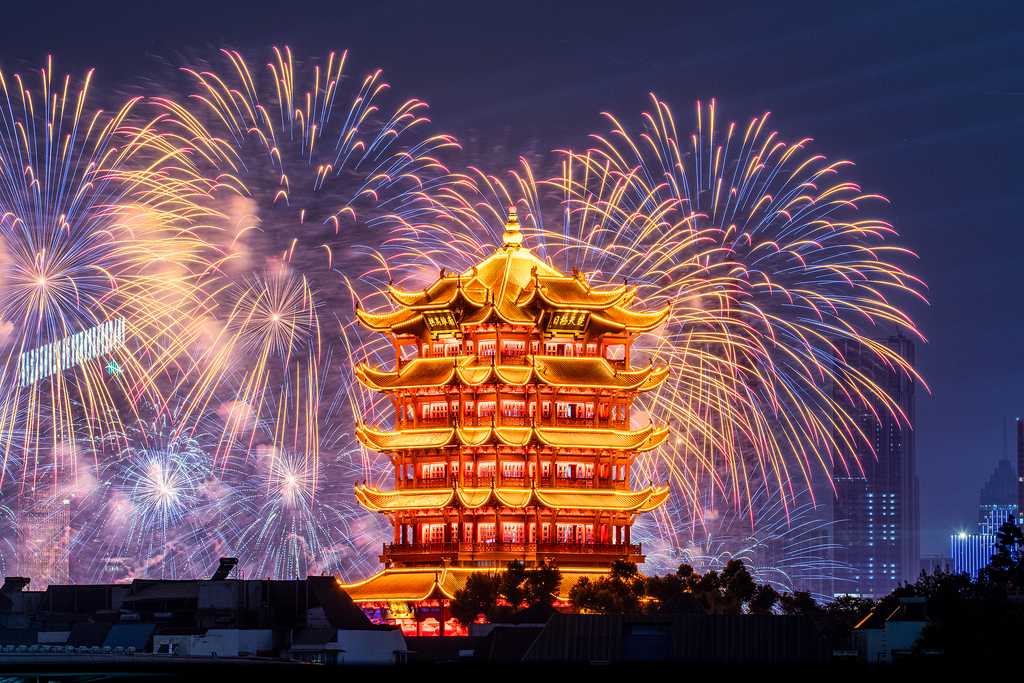 9月14日晚,长江文化艺术季开幕式在湖北武汉举行,绚丽烟花秀与美轮美奂的黄鹤楼相互映衬。