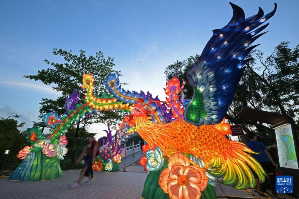 新加坡举行中秋灯会,众多民众来到裕廊湖花园观赏。