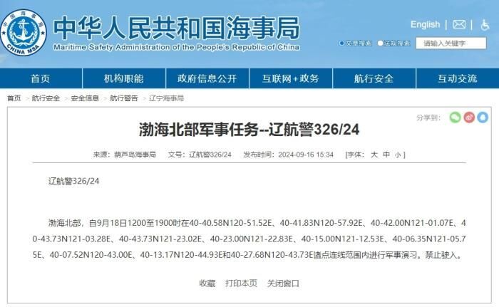 葫芦岛海事局发布航行警告,9月18日12时至19时,渤海北部部分海域进行军事演习,禁止驶入。
