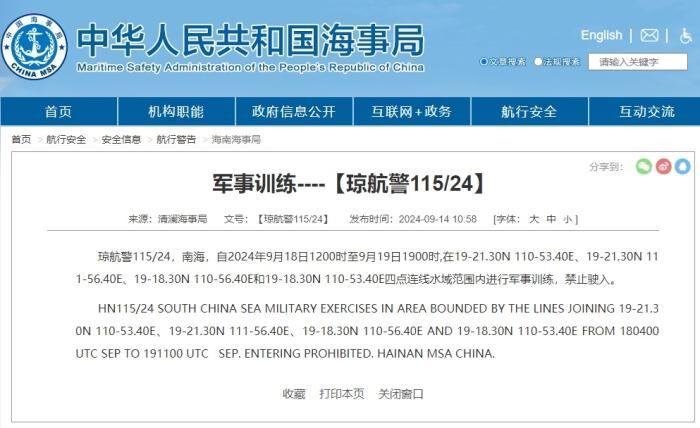 清澜海事局发布航行警告,9月18日12时至9月19日19时,南海部分海域进行军事训练,禁止驶入。