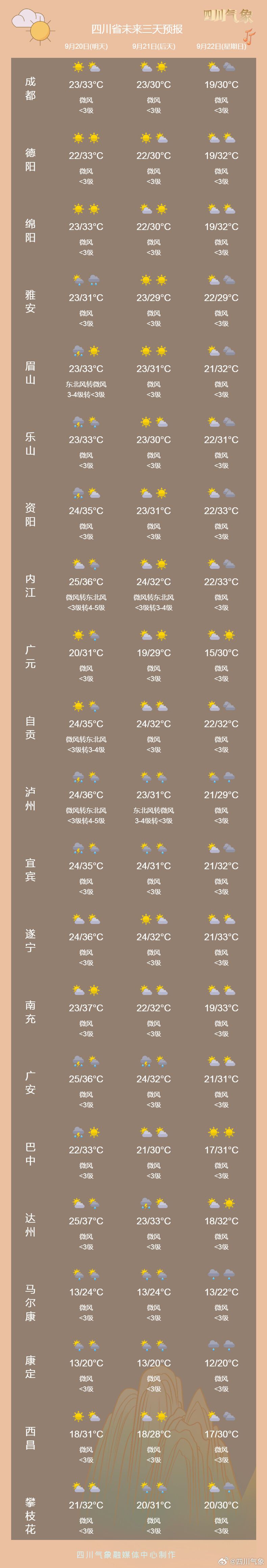 四川省气象台预计,9月20日,盆地西部南部有阵雨或雷雨,局部有中到大雨,个别暴雨,午后到夜间有4—6级偏北风,局部可达7级以上。未来三天,川西高原和攀西地区多阵雨或雷雨,局部中雨,需防范局地强降水带来的滑坡、泥石流等地质灾害。
