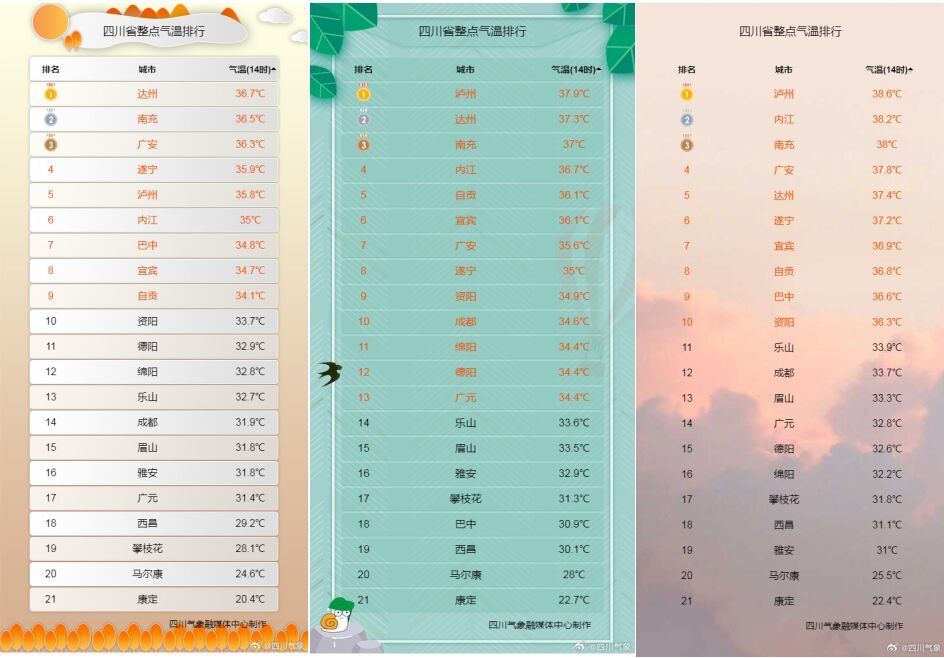 从左至右依次为9月17日、18日、19日四川各城市14时实况气温观测图