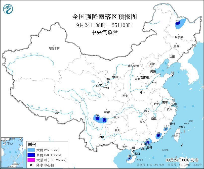 央视网消息:中央气象台9月24日6时继续发布暴雨蓝色预警:预计,9月24日08时至25日08时,黑龙江中北部、四川南部、福建东南部、广东东部和南部沿海、海南岛西部等地部分地区有大到暴雨,其中,广东南部沿海局地有大暴雨(100~120毫米),上述部分地区伴有短时强降水等强对流天气。