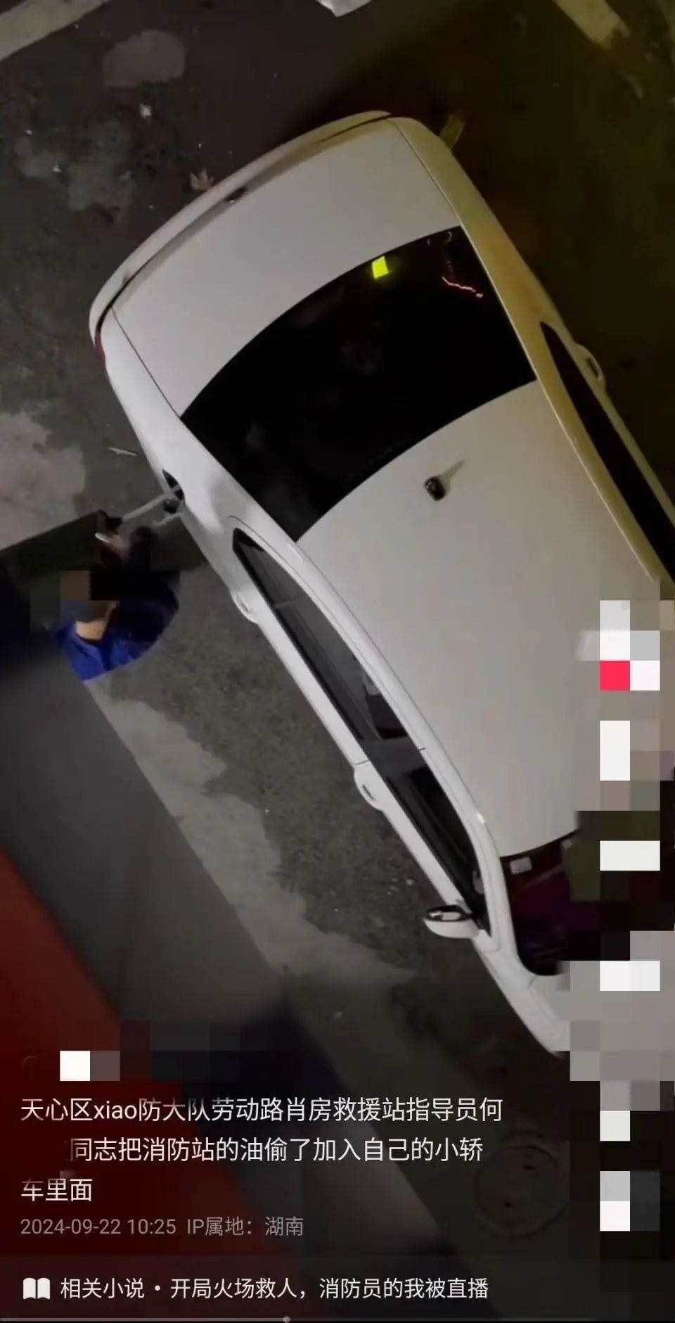 9月22日,一名网友发视频称:“天心区消防大队劳动路消防站指导员何某某同志将消防站的油偷了加入自己的小轿车里面。”相关情况引起广泛关注。