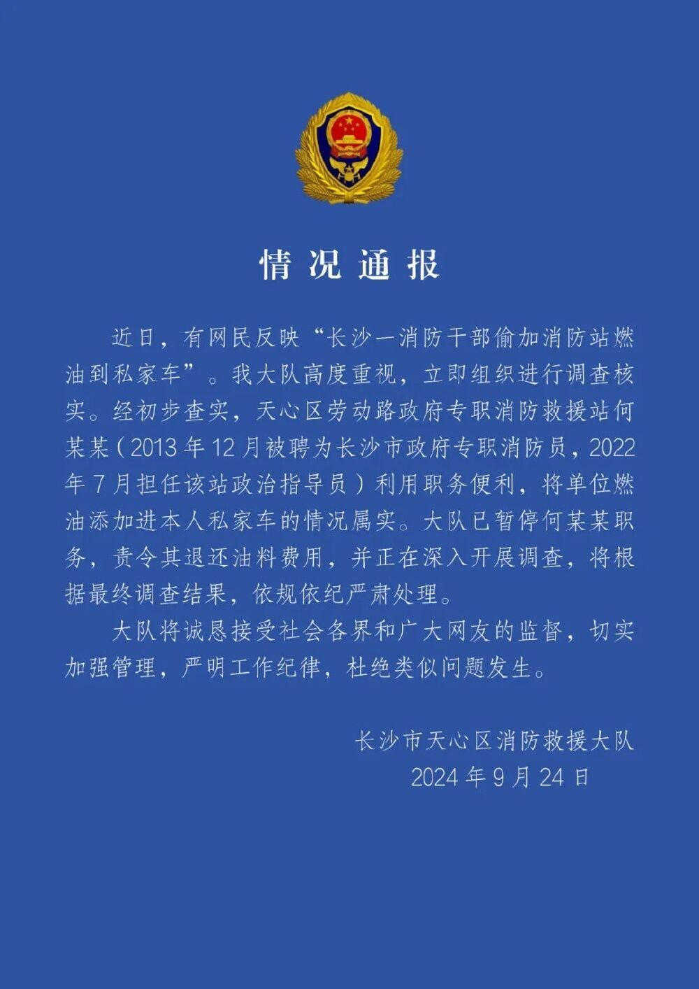 9月24日,长沙市天心区消防救援大队就该事件发布情况通报,称网友反映的情况属实,已暂停何某某职务,责令其退还油料费用,将根据最终调查结果,依规依纪严肃处理。