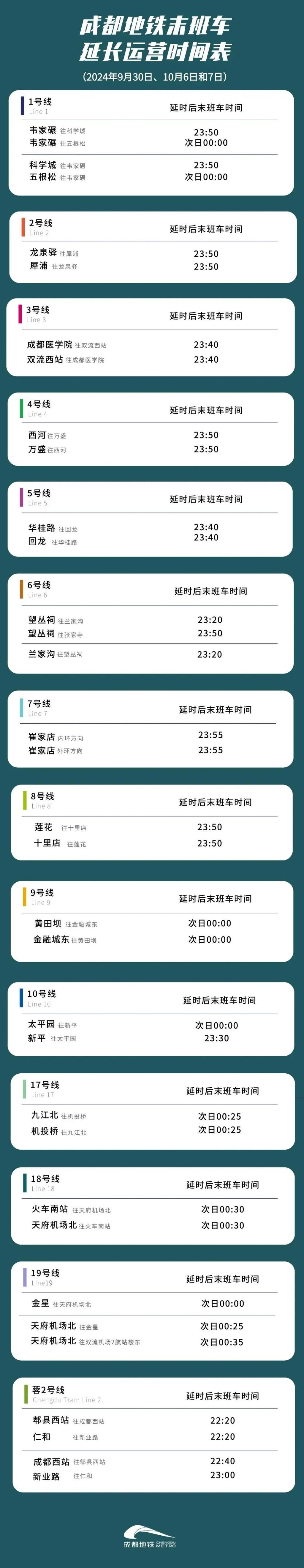 节前一天(9月30日)和节日最后两天(10月6、7日),线网各线延长运营服务时间50-60分钟,地铁服务热线同步延时,满足乘客假日出行及返程需求,提升线网运营服务水平。