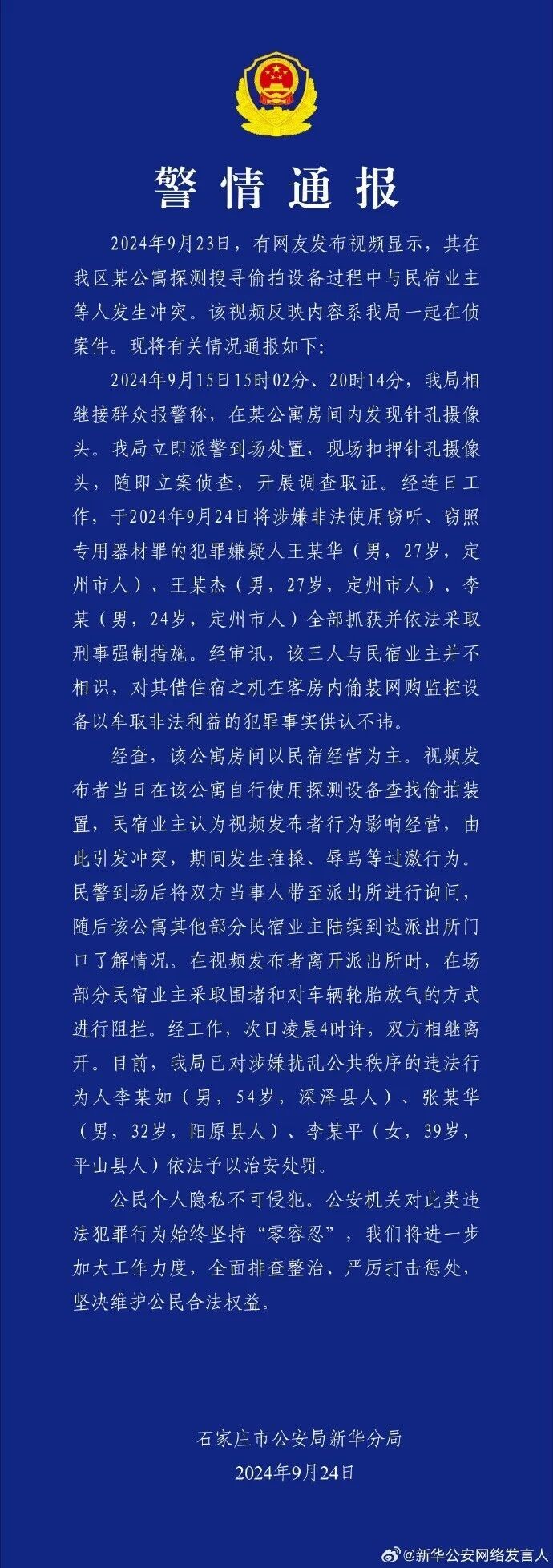 24日晚,石家庄市公安局新华分局发布警情通报称,已于9月24日将涉嫌非法使用窃听、窃照专用器材罪的犯罪嫌疑人王某华(男,27岁,定州市人)、王某杰(男,27岁,定州市人)、李某(男,24岁,定州市人)全部抓获并依法采取刑事强制措施。经审讯,这三人与民宿业主并不相识,对其借住宿之机在客房内偷装网购监控设备以牟取非法利益的犯罪事实供认不讳。