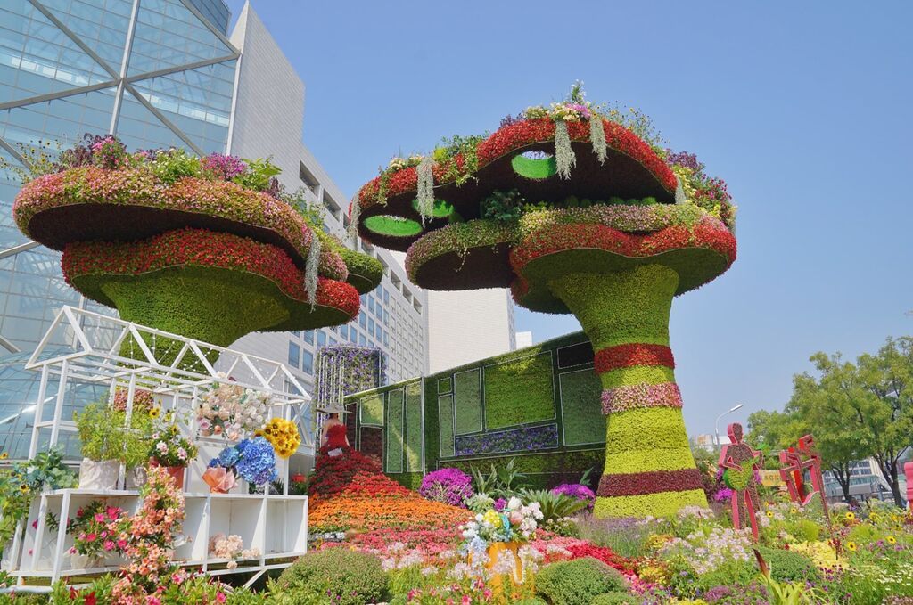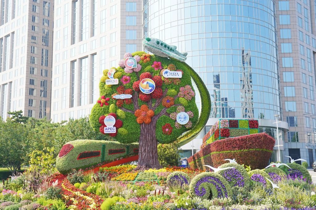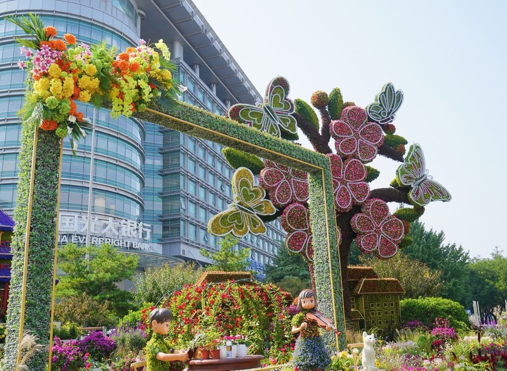 东单西北角,“开放中国”花坛以“一带一路”等重大国际活动取得硕果累累的成就为场景,体现了开放的中国为世界发展提供中国智慧、中国方案和中国力量。花坛顶高8米。
