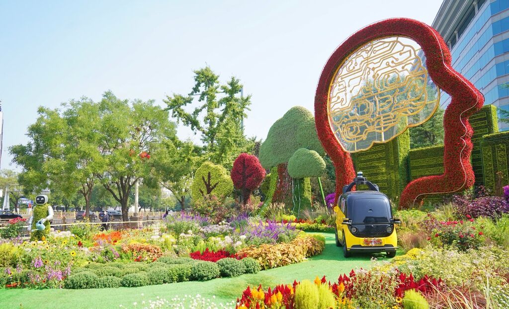 西单东南角,“花园园区”花坛以生机盎然的科技园区为主景,展示了脑机接口技术、智能机器人、无人送货车等现代科技的同时体现了舒适、温馨的科技花园园区环境。花坛顶高7.5米。