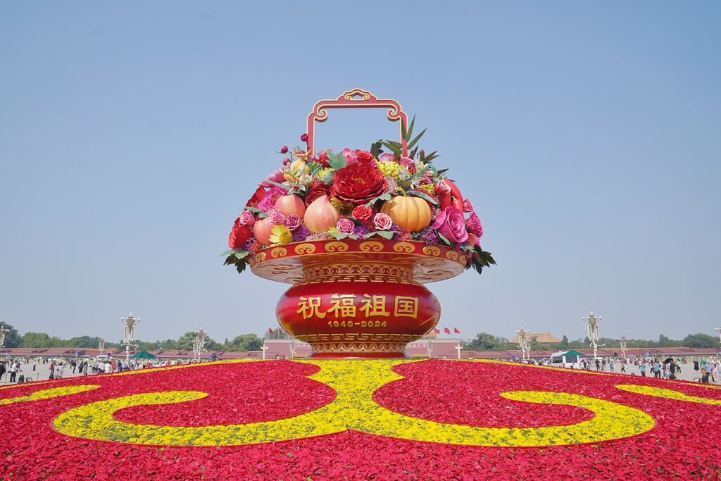 建国门西北角,“普天同庆”花坛以嵌有“1949-2024”的红旗为主景,配以烟花、白鸽、庆祝标语等,热烈庆祝中华人民共和国成立75周年。花坛顶高8米。