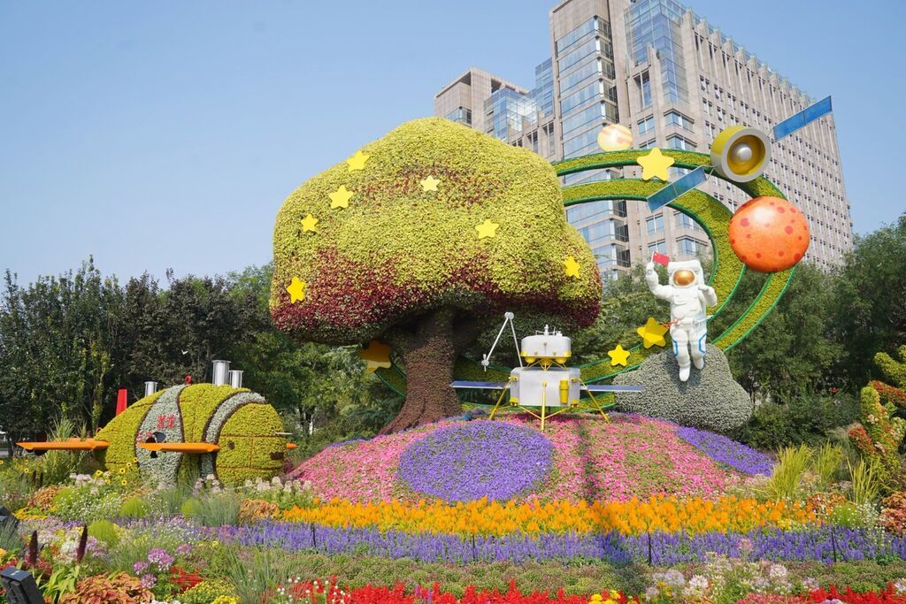 东单东北角,“创新中国”花坛以探月工程嫦娥六号月球背面采样及深海资源探测为场景,配以着陆器、轨道器、航天员、桂花树、潜龙三号等元素,展示我国建设航天强国、科技强国取得的标志性成果。花坛顶高8.5米。