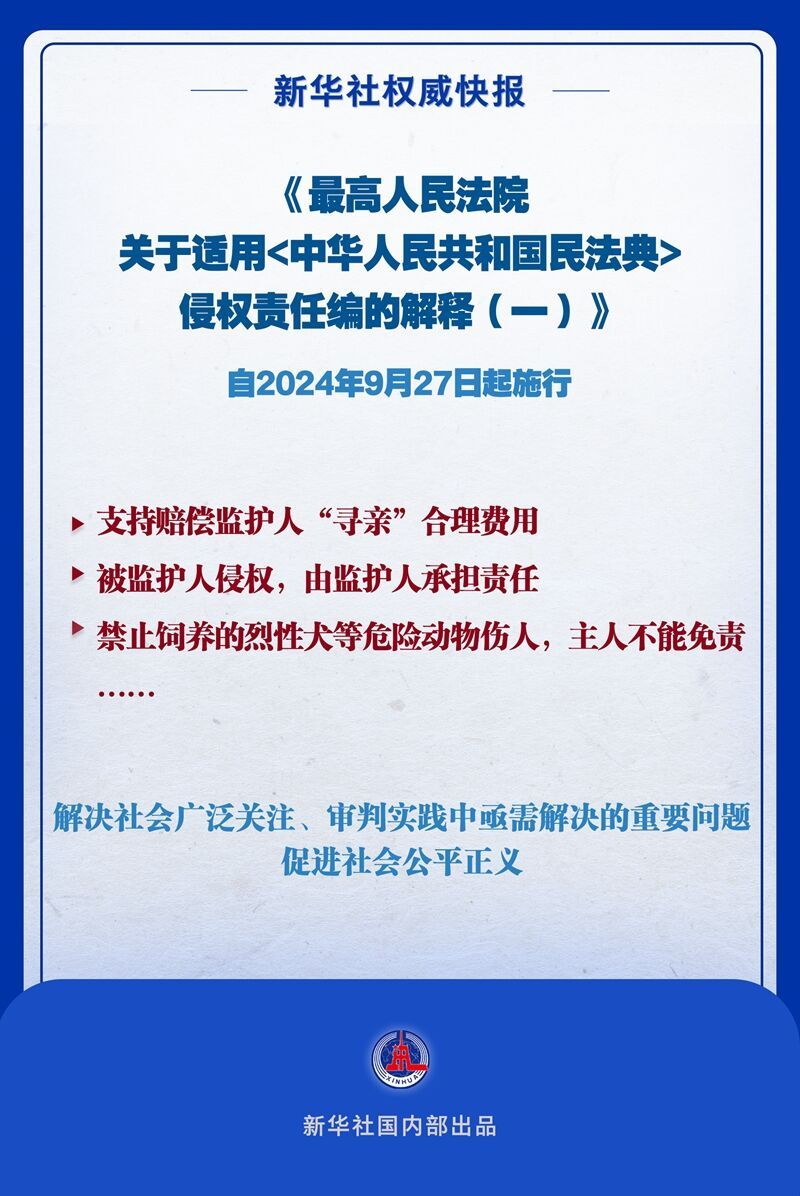 《最高人民法院关于适用<中华人民共和国民法典>侵权责任编的解释(一)》9月26日发布,自9月27日起施行。司法解释聚焦民法典实施后社会广泛关注、审判实践中亟需解决的重要问题,明晰责任、定分止争,保障和促进社会公平正义。