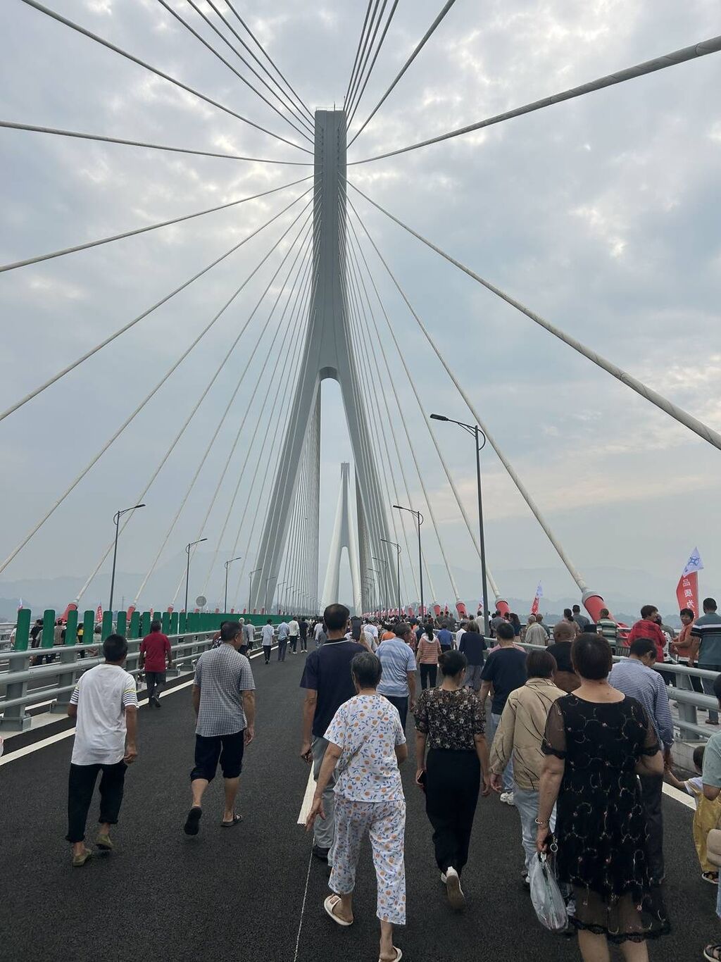 家门口的大桥通了,两岸居民一早来到现场等待,以“踩桥”的传统方式庆祝通车。