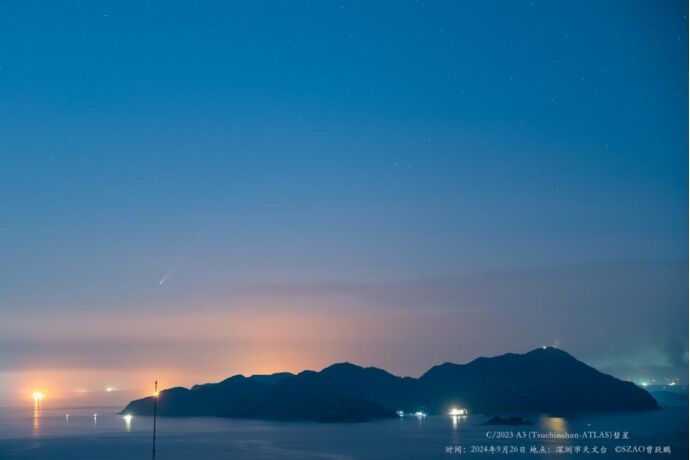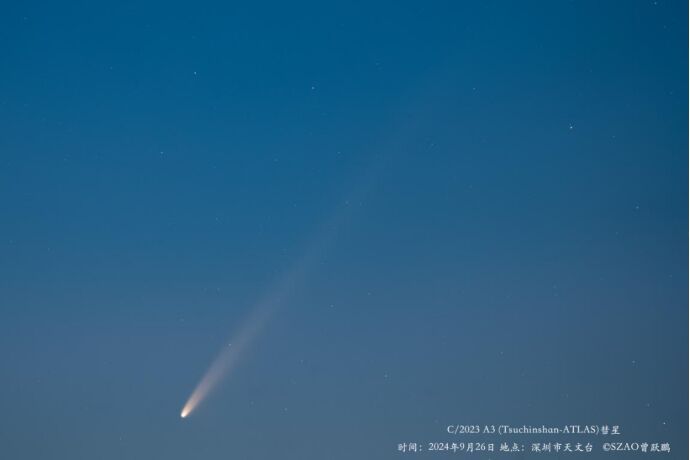 9月26日清晨,深圳西涌首次拍到了今年备受瞩目的紫金山-阿特拉斯彗星(C/2023 A3)。深圳市天文台天文部部长梅林介绍,该彗星在2023年1月9日由紫金山盱眙观测站发现,它是典型的近抛物线彗星,轨道周期极其漫长,达61751年。它将于2024年9月27日过近日点“如果它能保持状态完整通过近日点并抵达地球附近,预计10月9日将达到-4.6等的视亮度,甚至白天可见。”