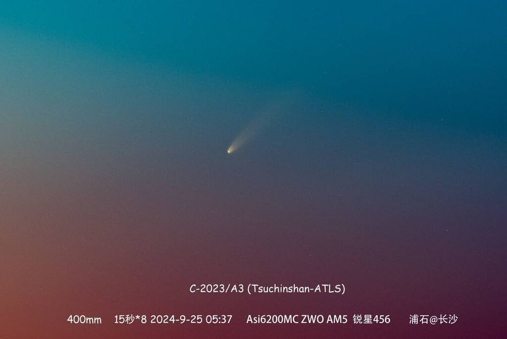 “极光是地球自己的美丽,彗星是来自深空的访客。彗星的周期最短也要将近100年,每颗彗星和我们的相遇都是一生一次。”这几天,让天文圈沸腾的今年最值得期待的彗星紫金山-阿特拉斯C/2023 A3(Tsuchinshan-ATLAS)已经可以拍到了。朋友圈里,已经开始排队打卡晒彗星。资深天文爱好者浦石,9月25日早上5:37,在长沙拍到了这颗略带橘黄色的彗星。