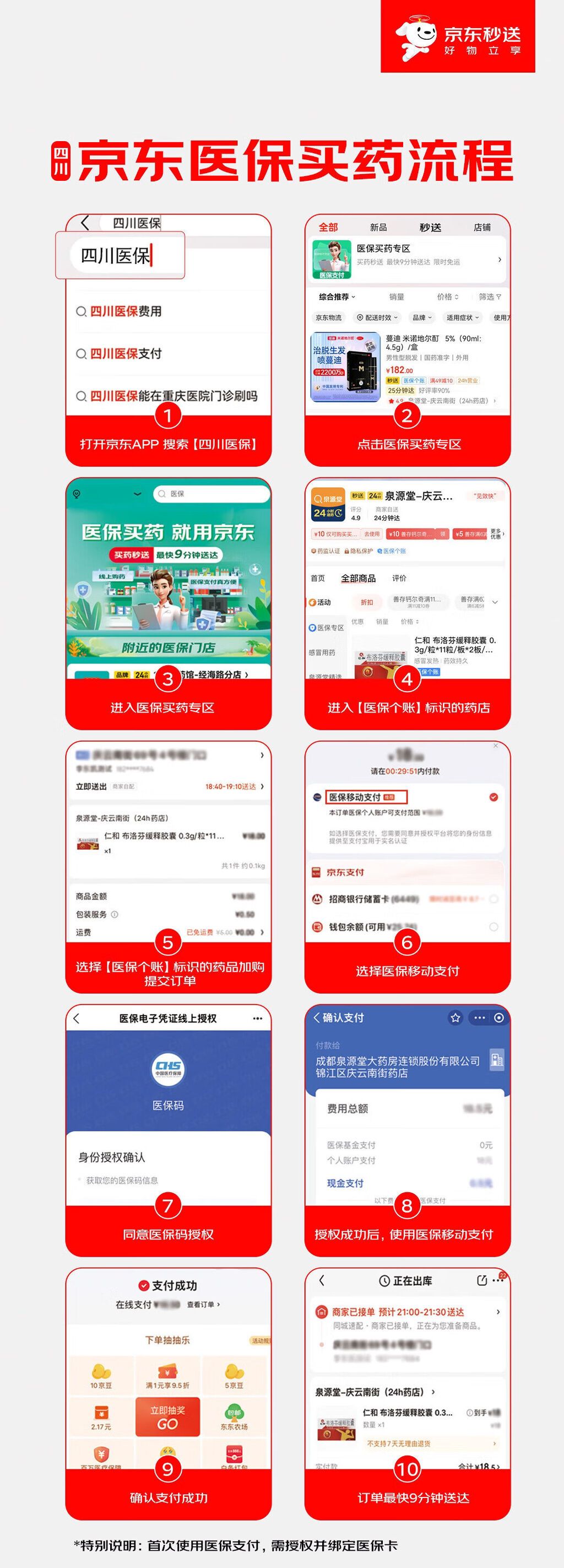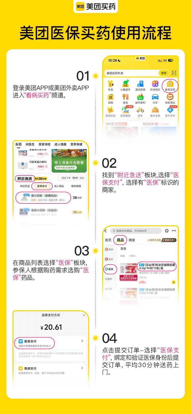 试点地区基本医保参保职工可通过美团、饿了么、京东等互联网购药平台,在具有“医保”标识的药店购买OTC非处方药品时,选择使用“医保移动支付”进行付款,药品费用即可使用医保个人账户进行支付,配送、包装等部分需个人现金支付,实现“手机下单买药、医保个账支付、即时配送到家”。开通线上买药医保支付方式后,可以降低个人外卖买药额外的现金支出。下单完成后,购药平台骑手将送药到家。