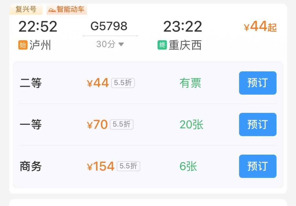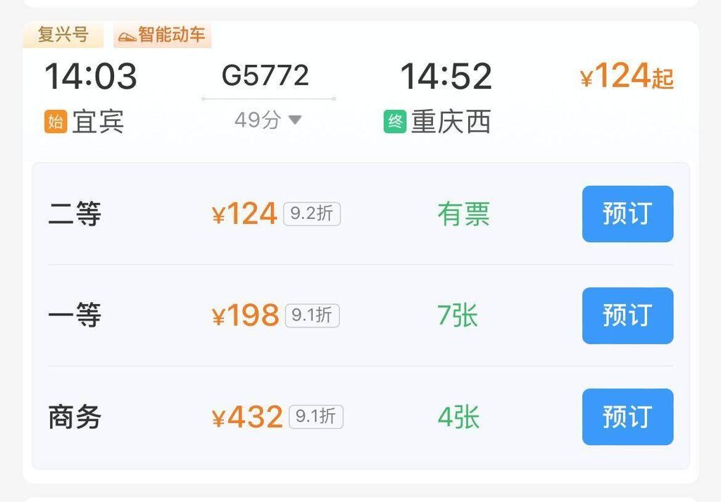 从票价来看,宜宾往返重庆西站的商务座最低476元,一等座最低218元,二等座最低136元。泸州往返重庆西站商务座最低280元,特等座最低144元,一等座最低118元,二等座最低74元。